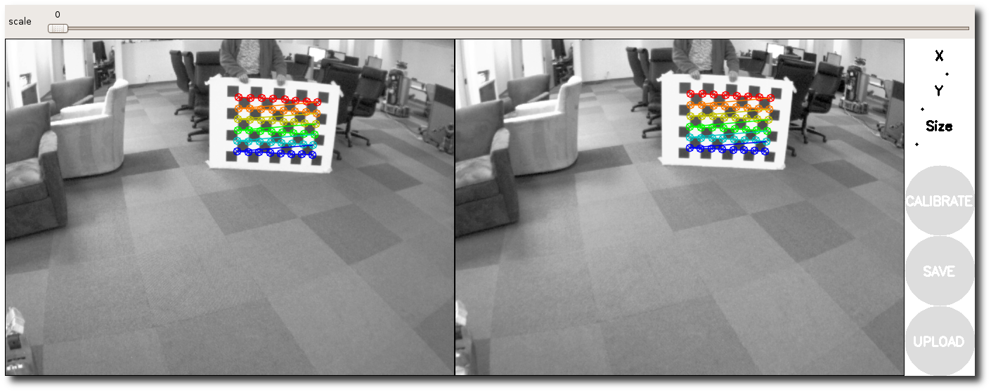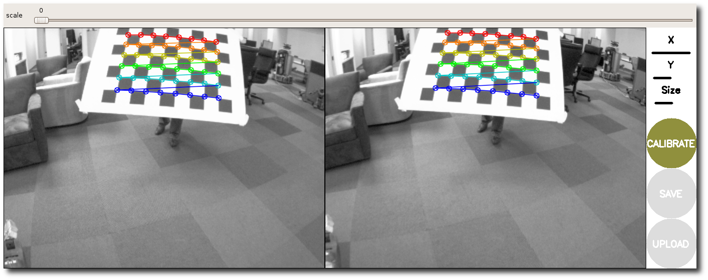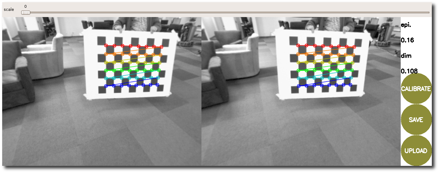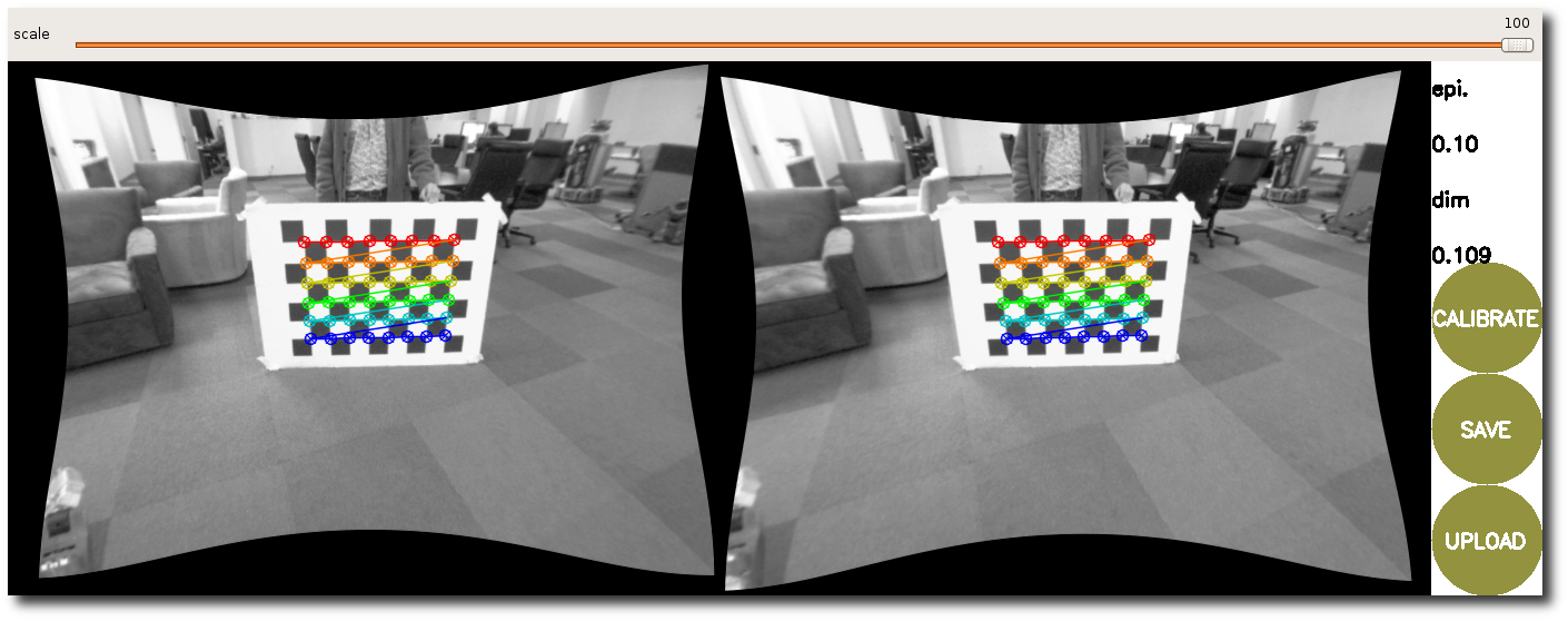 You can also use the slider at the top of the calibration window to change the size of the rectified image, as shown below. A scale of 0.0 means that the image is sized so that all pixels in the rectified image are valid. The rectified image has no border, but some pixels from the original image are discarded. A scale of 1.0 means that all pixels in the original image are visible, but the rectified image has black borders where there are no input pixels in the original image.